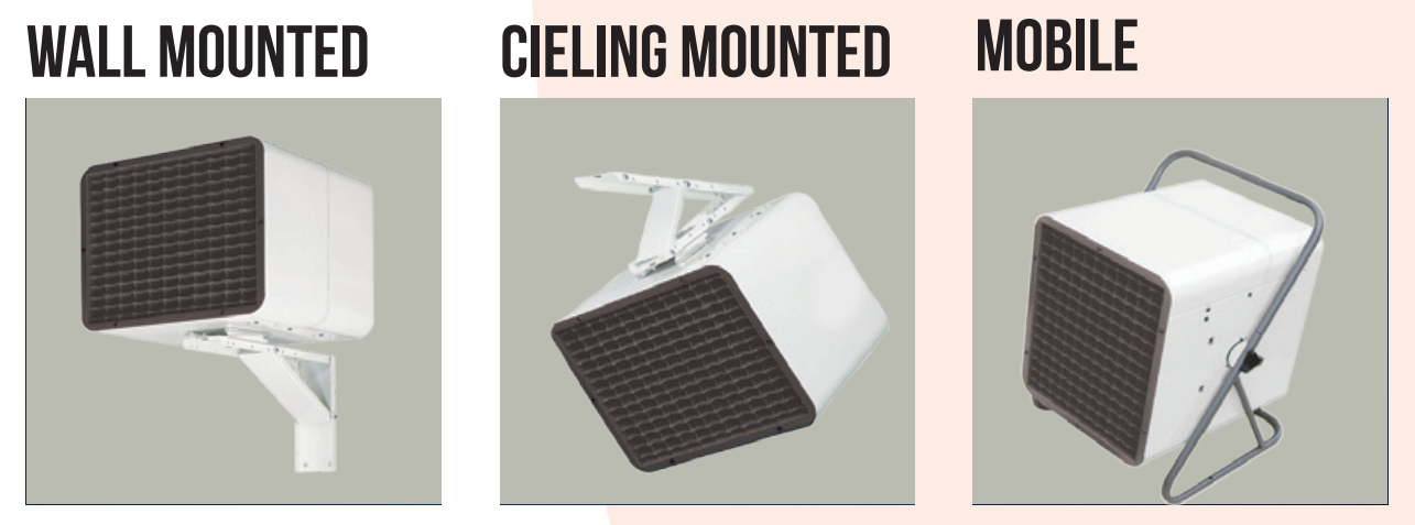 Multi-directional fan heater (Airpuls4) with a coated electro-galvanized steel body, designed for intensive use, providing warmth and comfort in large areas with efficient, even heat distribution that minimizes temperature stratification. Specifications: 230V single-phase / 3x400V three-phase (Y) - 6000/9000W (2 power settings - 6 operating functions) - 920/1100 m³/h max flow rate - airspeed up to 15 - 20m/s - Class 1: IP44 and IK08 - 47,0 x 38,0 x 54,5 cm - 180° horizontal and 90° vertical rotation - 25,1 kg. Features an auto-reset function for thermal safety, easy wall or ceiling installation with mounting bracket or a mobile setup with an optional stand kit. Supplied with integrated controls or optional digital control box (Aircom4).