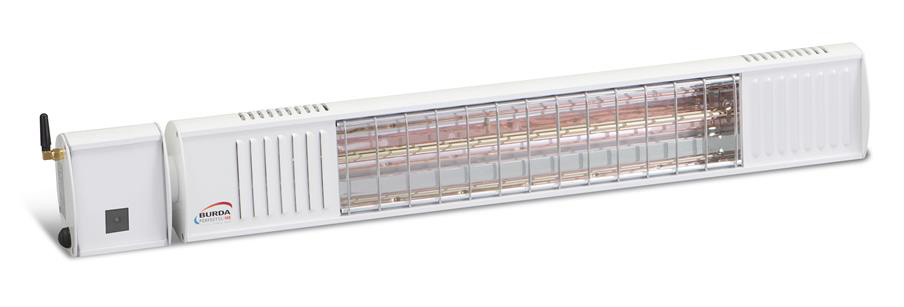 Smart short-wave watertight electric patio infrared heater (TERM2000 BLUETOOTH - Anthracite ALU), equipped with an infrared HeLeN gold-coated lamp, reliably delivering maximum instant warmth and consistent heating in all outdoor areas, even in humid or snowy conditions. Specifications: Schuko plug 230V 50Hz ~ 1/N/PE (GB and CH plug on demand) - 2000W - IP67 - 14 to 16m² heatable area - 71 x 9,5 x 12,5cm - 45° rotation range - 2,5kg. Smart (Bluetooth) features: Free BURDA app for IOS/Android - range of 50m (app) / range of ± 6m (remote) - independent or simultaneous control of up to 8 heaters - adjustable heat output (25% - 100%) - timer with auto shut-off - programmable tilt-sensitivity safety switch. For more details on the TERM2000 heater, visit the dedicated page.