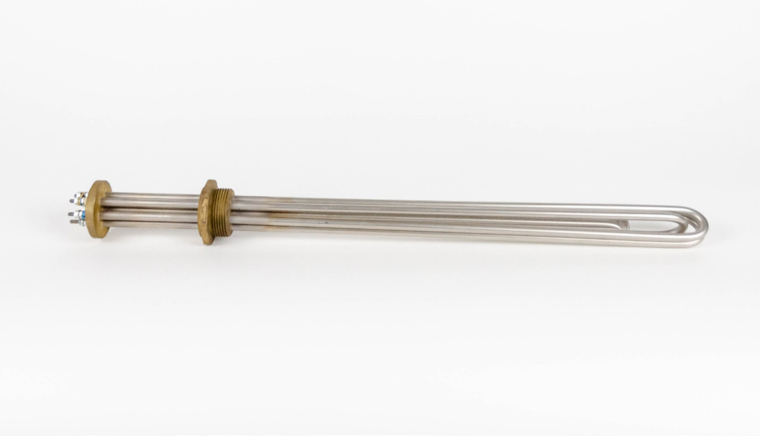 Extended screw plug immersion heater (G2) with Ø57mm front flange (100mm offset), equipped with Ø8,5mm SS321 heating elements and an integrated thermostat pocket (Ø8 x 0,5mm), developed and refined for the heating of oil at high temperature (≤ 250°C). The screw plug and flange are made of brass. Specifications: 230V / 400V - 3000W - 2,5 W/cm² - immersion length of 835mm - non-heated length of 30,4mm from screw plug. Optional ALU connection box small/large is available.
