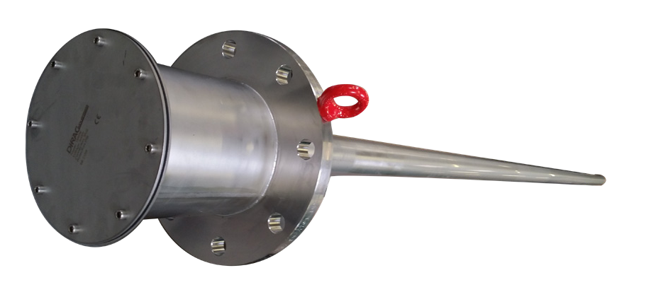 Flanged immersion heater equipped with welded SS304 single-pocket for fitting of ceramic core elements (RBC HT Ø54mm), designed for efficient liquid heating via natural of forced convection. Specifications: DN80 / PN16 - 230V single-phase / 3x400V three-phase (Y) - 2000W - 2,4 W/cm² - immersion length of 655mm including 125mm non-heated. Connection box on flange.